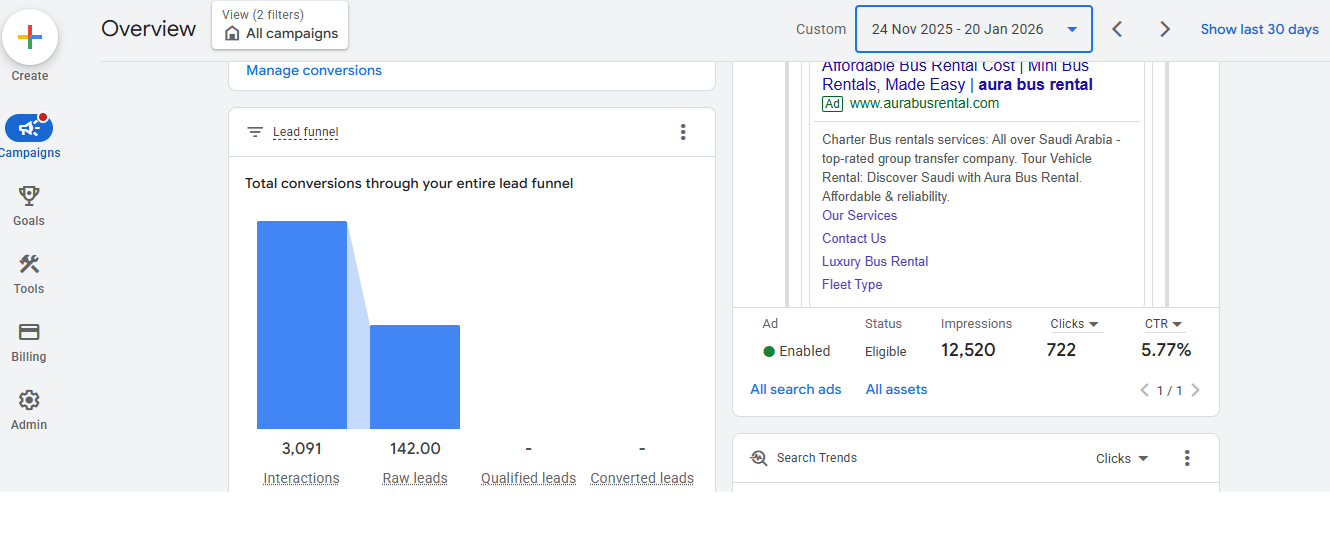 3. Google Search Ads – Built campaigns around high-intent bus rental and corporate transport keywords – Wrote intent-matched ad copy with clear value props and CTAs – Set up conversion tracking (forms, calls, key on-site actions) – Continuously optimized keywords, bids, and ad variations for better CPL